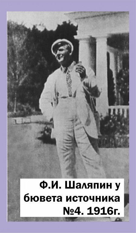 На вокзале Шаляпина встречала толпа. Номер ему был заказан в только что отстроенной Ново-Казенной гостинице вблизи парка (ныне старый корпус санатория «Москва»). В одном из многочисленных писем он отмечает: «Кисловодск – очарование, Ессентуки – восторг! Отдыхом я доволен – немного похудел…» Шло время, состояние здоровья Шаляпина потребовало новой поездки в Ессентуки на трехнедельное лечение. Это было в 1916 году. Дочери Ирине он писал: «Мне все равно надо ехать в Ессентуки, поэтому я решил лучше сейчас же отправиться в это лечебное место с тем, чтобы, не теряя зря времени, как можно скорее освободиться от лечения».